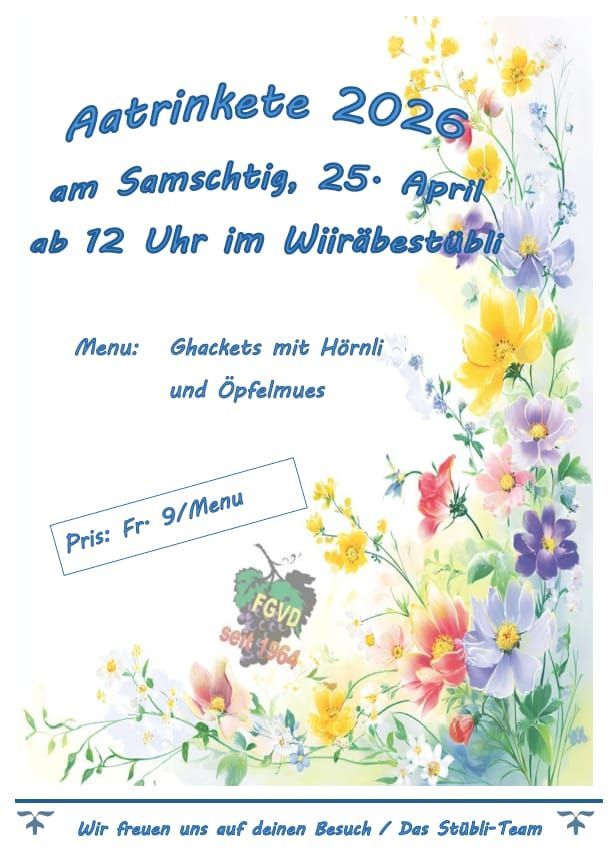 Gerne begrüssen wir Euch am 25. April 2026, ab 12.00 Uhr zur "Aatrinkete".